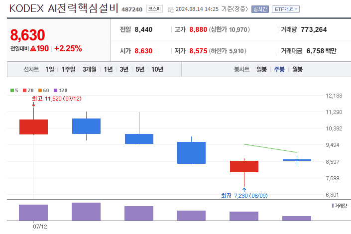 Kodex AI전력핵심설비 ETF는 상장 이후 짧은 기간 동안 약 -22%의 수익률을 기록했습니다. 이는 전반적인 시장 상황의 영향을 받은 것으로 판단됩니다.
