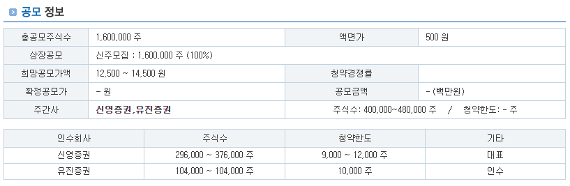 공모 주간사로는 신영증권과 유진증권이 선정되었으며, 일반 투자자에게 배정될 예정인 주식 수는 400,000~480,000주로 예상됩니다. 청약한도는 현재 공개되지 않은 상태입니다.