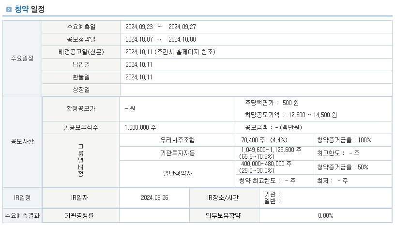 위 일정을 참고하여 공모주 청약 준비를 해야 합니다. 특히 2024년 10월 7일부터 8일까지 이틀간 진행되는 공모청약 기간을 놓치지 않도록 주의가 필요합니다.