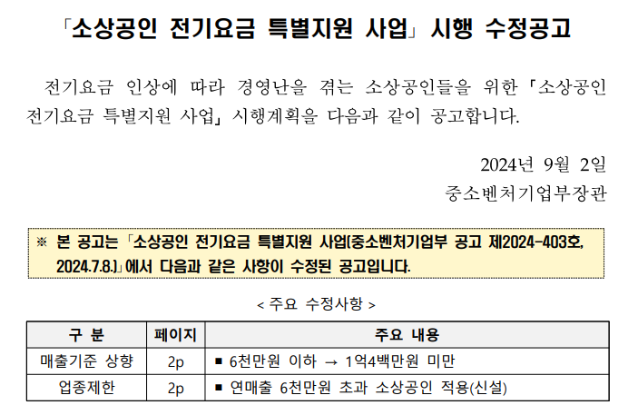 | 지원 대상 자격 | - 2024년 2월 15일 기준 운영 중인 사업 - 2023년 12월 31일 이전 개업 - 2022년 또는 2023년 매출 1억400만원 미만 - 사업장용 전기요금 부담 사업자 |