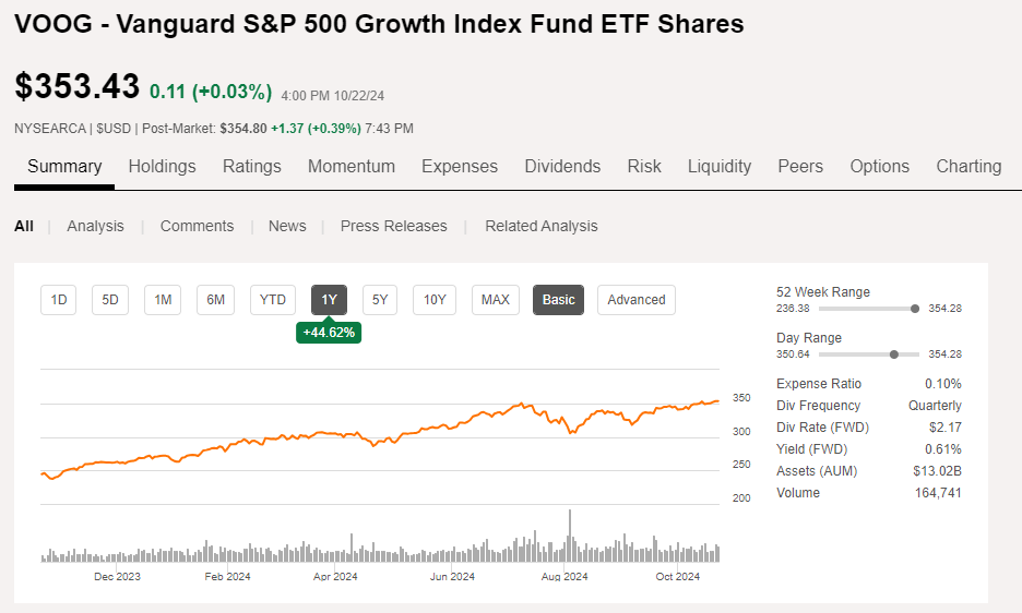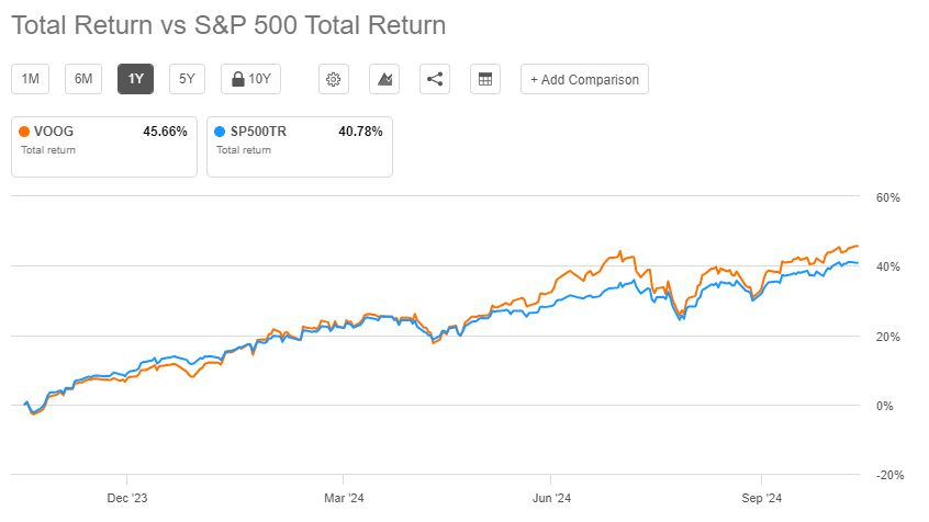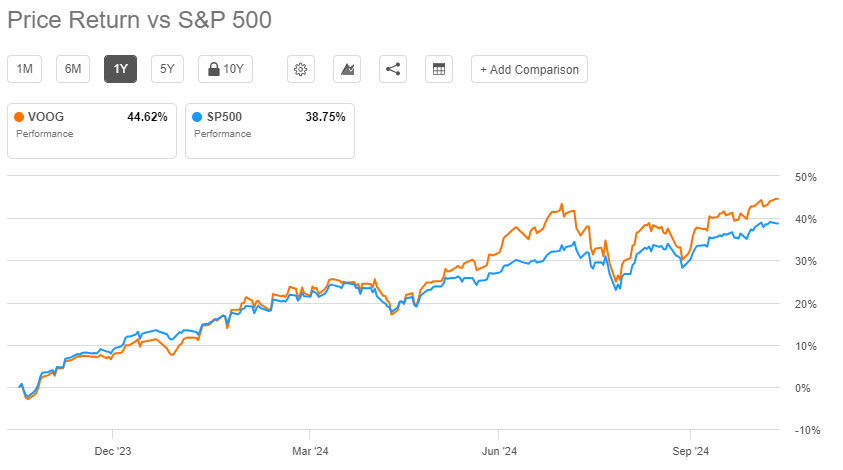 밴가드에서 운용하는 VOOG ETF는 14년의 운용 역사를 보유한 대형 ETF입니다. 130억 달러가 넘는 시가총액을 보유하고 있으며, 최근 1년간 S&P 500 지수보다 약 6%p 높은 수익률을 달성했습니다.