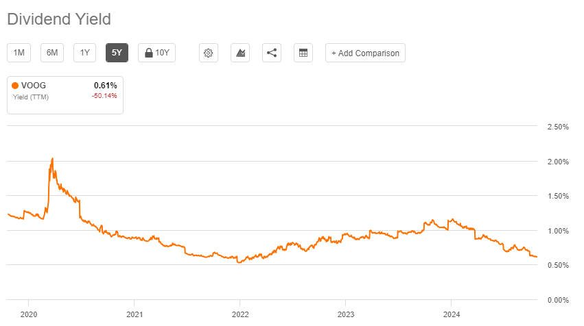 VOOG ETF는 분기별로 배당금을 지급하는 정책을 유지하고 있습니다. 다만 성장주 중심의 포트폴리오 특성상 배당수익률은 0.61%로 상대적으로 낮은 수준입니다.