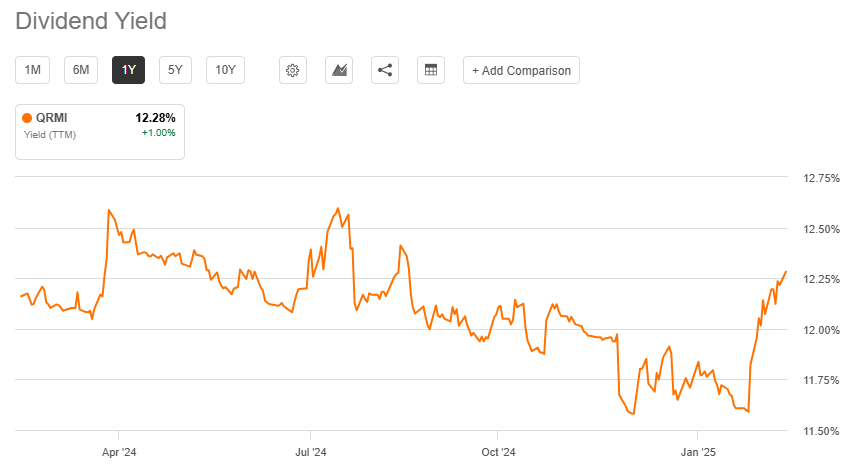 QRMI ETF의 가장 큰 매력 중 하나는 월별 배당 지급 구조입니다. 최근 12개월간 지급된 배당금의 합계(TTM)는 주당 $2.06로, 현재 가격 기준 12.22%의 높은 배당률을 기록하고 있습니다.
