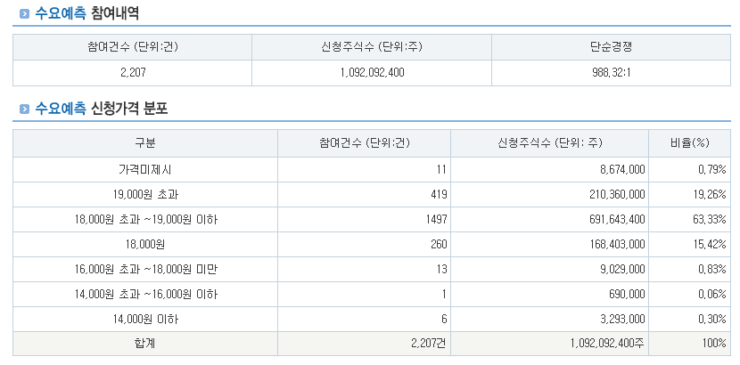 | 수요예측 경쟁률 | 988.32 : 1, 공모가 18,000원 (밴드 상단 대비 28.57% 초과) |