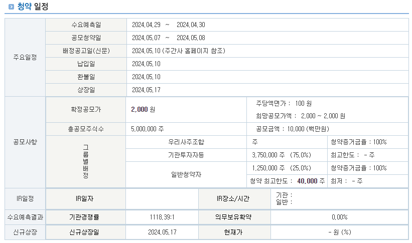 2024년 5월 7일부터 8일까지 이틀에 걸쳐 일반 청약이 진행되는데, 일반 청약자에게 배정되는 물량은 25%인 1,250,000주입니다. 청약 증거금은 100% 납부해야 하며, 납입일과 환불일은 5월 10일입니다. 상장일은 5월 17일로 예정되어 있습니다.
