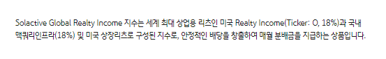 지금까지 미국 리츠와 국내 대표 인프라에 집중 투자하는 월배당 ETF, KBSTAR 글로벌리얼티인컴에 대해 살펴보았습니다. 이 상품은 인컴에 특화된 포트폴리오를 바탕으로 매월 꾸준한 배당 수익 창출을 노리고 있습니다.