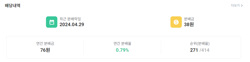 이 ETF는 월 단위로 정기 분배금을 지급하는 월배당 상품입니다. 가장 최근인 2024년 4월 29일에는 주당 38원의 배당을 결정했습니다. 상장 초기인 만큼 월별 편차는 크지 않은 상황인데요. 월 배당금 38원이 유지된다고 가정할 때 연간으로는 456원, 연 배당률로는 4.70% 수준이 예상됩니다.