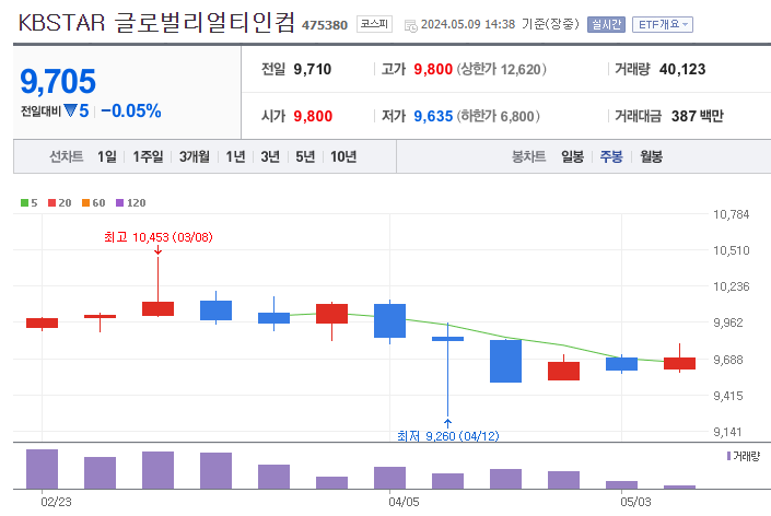 이 ETF는 해외 리츠와 인프라에 투자하는 부동산 상품으로 분류됩니다. 설정 규모는 398억원이며, 상장좌수는 4,100,000주입니다. 지난 1년간 최고가는 10,530원, 최저가는 9,295원을 찍었습니다. 2024년 2월 20일 신규 상장되어 시장 검증 기간이 길지 않은 신생 펀드입니다. 운용보수는 동종 ETF 대비 낮은 연 0.09% 수준이며, 운용사는 KB자산운용입니다.