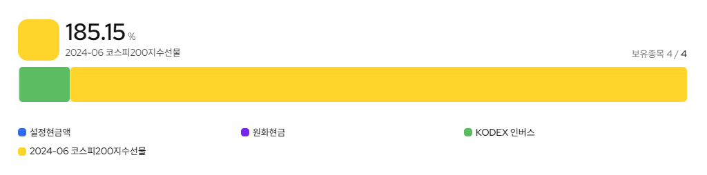 주요 보유 종목을 살펴보면 KODEX 인버스 ETF가 15.13%, 그리고 2024년 6월물 KOSPI200 선물이 185.15%를 차지하고 있어 인버스 및 선물 전략이 복합적으로 활용되고 있음을 알 수 있습니다.