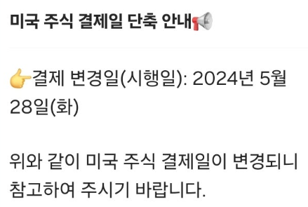 국내 주요 증권사들이 일제히 공지한 내용에 따르면 이번 미국 주식 결제일 변경은 미국 SEC의 결제주기 제도 변경에 따른 것입니다. 오는 5월 28일부로 미국 현지에서의 주식 결제일이 기존 T+2일에서 T+1일로 단축됨에 따라 국내에서 거래되는 미국주식 역시 D+3일에서 D+2일로 결제일이 하루 줄어들게 되는 것입니다.