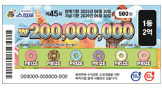 | 1등 | 오억원(500,000,000원) | 9매 | 1/5,000,000 |