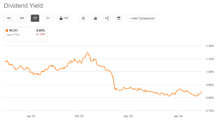 MOAT ETF는 연 1회 배당금을 지급하고 있으며, 직전 12개월 기준 배당수익률(TTM)은 0.83% 입니다.