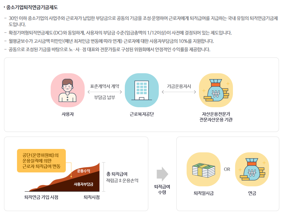 | 기본 개요 | - 30인 이하 중소기업 근로자 대상 퇴직연금제도 - 근로복지공단이 기금 운용의 주체가 되어 안정적 운용 - 사용자 부담금 수준은 임금총액의 1/12 이상으로 사전 확정 |