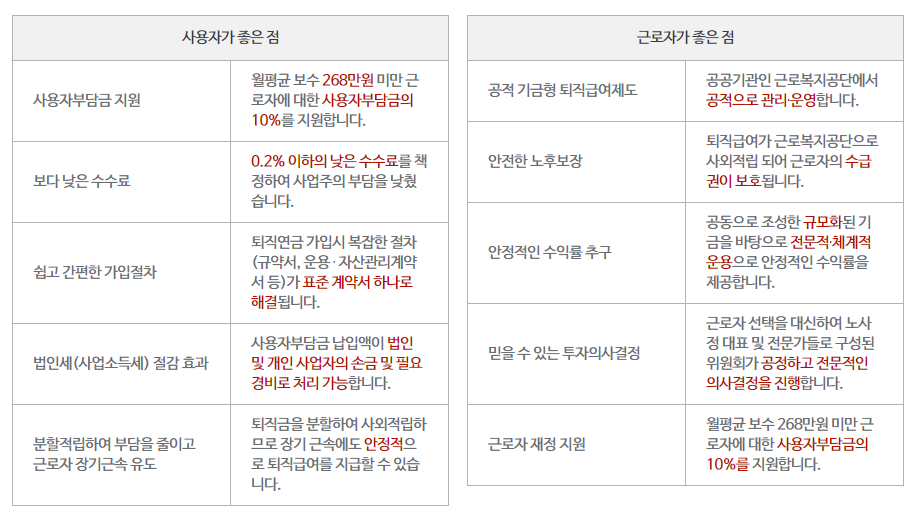 | 장점 | - 근로복지공단의 전문성을 바탕으로 한 안정적 기금 운용 - 사업주의 퇴직연금사업자 선정 및 관리 부담 경감 - 근로자의 안정적 수익 기대 가능 |