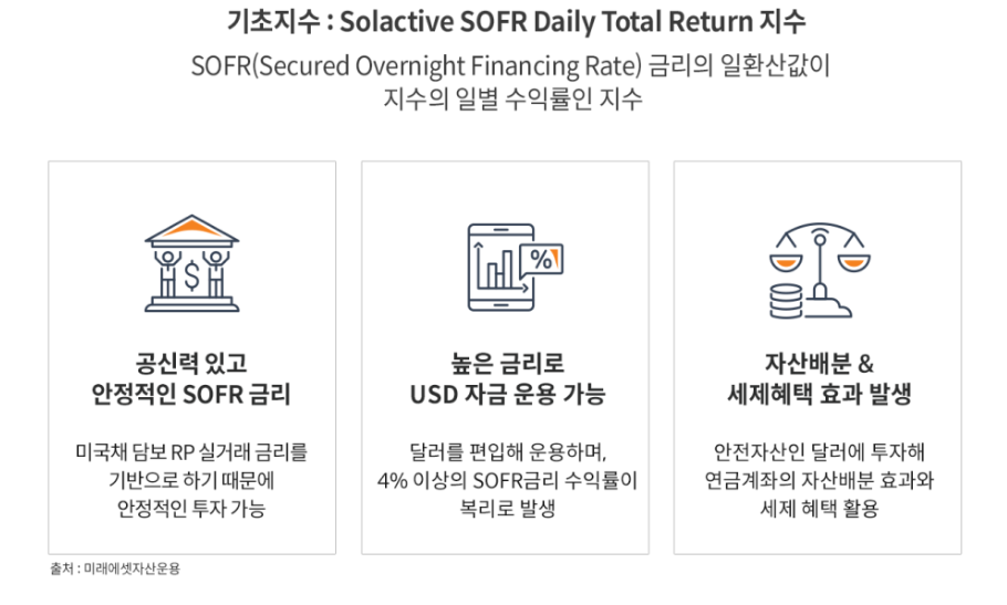 | TIGER 미국달러SOFR금리액티브(합성) | 미래에셋자산운용 | 0.10% | 달러 표시 및 달러 기준 설정/환매 가능 |