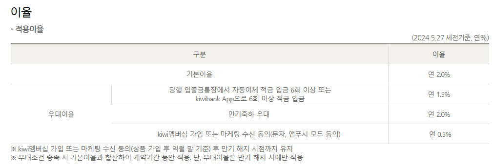 여기에 'kiwi멤버십'에 가입하거나 마케팅 수신에 동의하는 고객에게는 0.5%의 우대금리가 추가됩니다. 단, 이는 적금 가입 후 다음 달 말을 기준으로 판단하며 만기까지 자격을 유지해야 합니다.