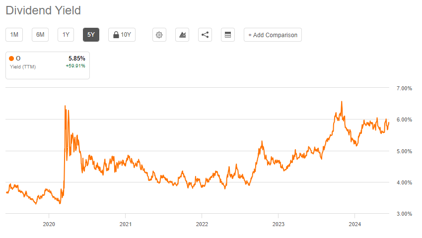 리얼티인컴의 배당 정책은 월배당입니다. 1994년 상장 이래 단 한 번도 거르지 않고 매월 배당금을 지급해 왔죠. 배당 수익률은 2023년 6월 기준 6.03%로 매력적인 수준을 자랑합니다.